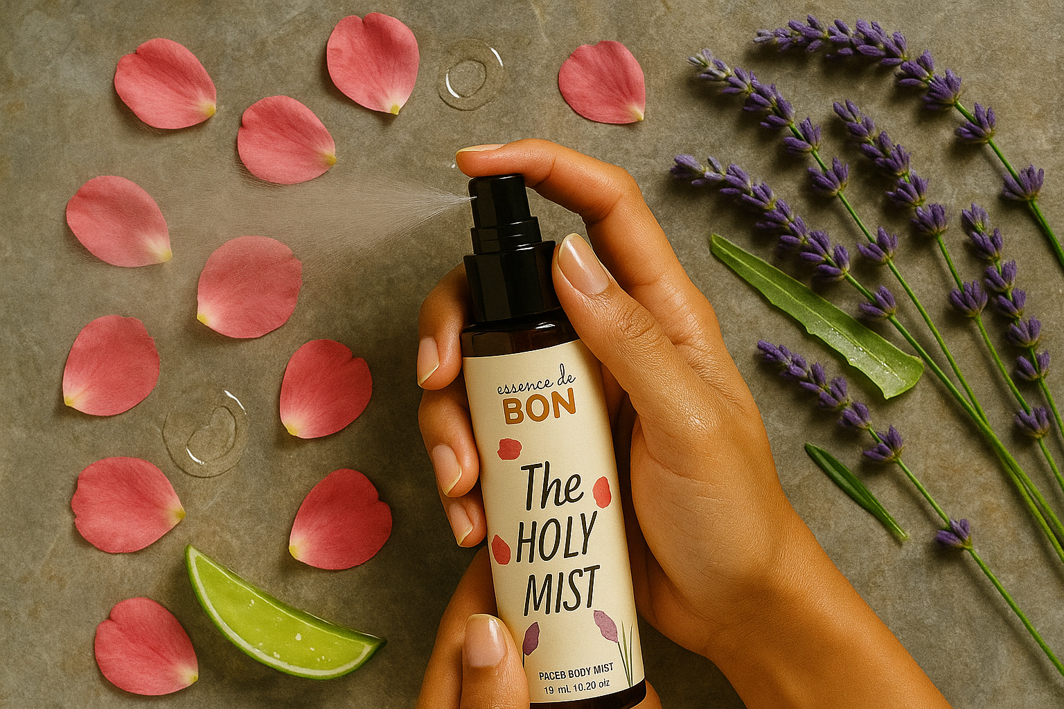 The Holy Mist is your pause in a bottle — a cooling blend of rose, lavender, and antioxidant-rich green tea that quiets the world and softens the skin. Made for faces that feel too much, and still glow.